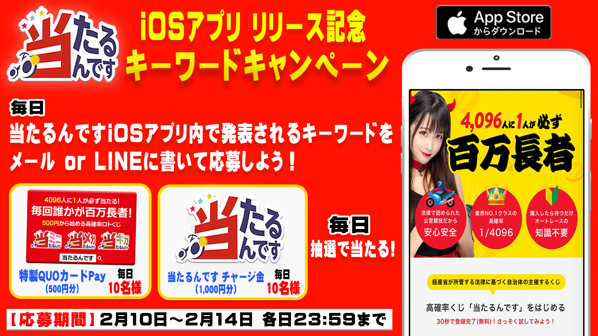 当たるんです 当選確率1 4096 当たるんです Iosアプリdlキャンペーン Iosアプリをダウンロードして Quoカードpay やチャージ金が毎日当たるチャンス アプリ内のキーワードを書いて応募 毎日10名様に Quoカードpay が当たる 応募